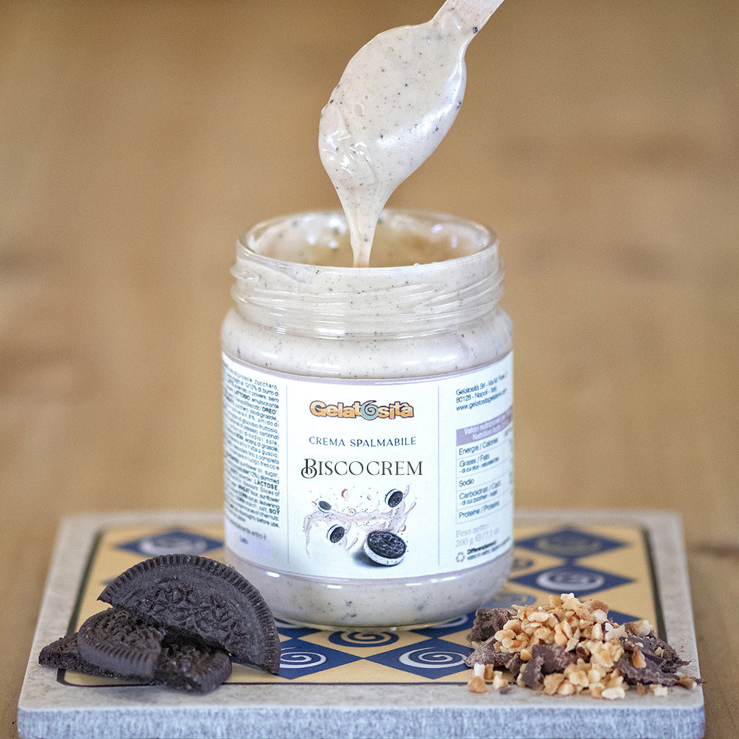 La Crema BISCOCREM ha un sapore vellutato, è la crema MUYCREM arricchita da una polvere finissima di biscotto di Oreo® appena percettibile al palato, che crea un delizioso contrasto con la dolcezza della nocciola chiarissima alla base. Il risultato è una crema perfettamente bilanciata e dal carattere originale.