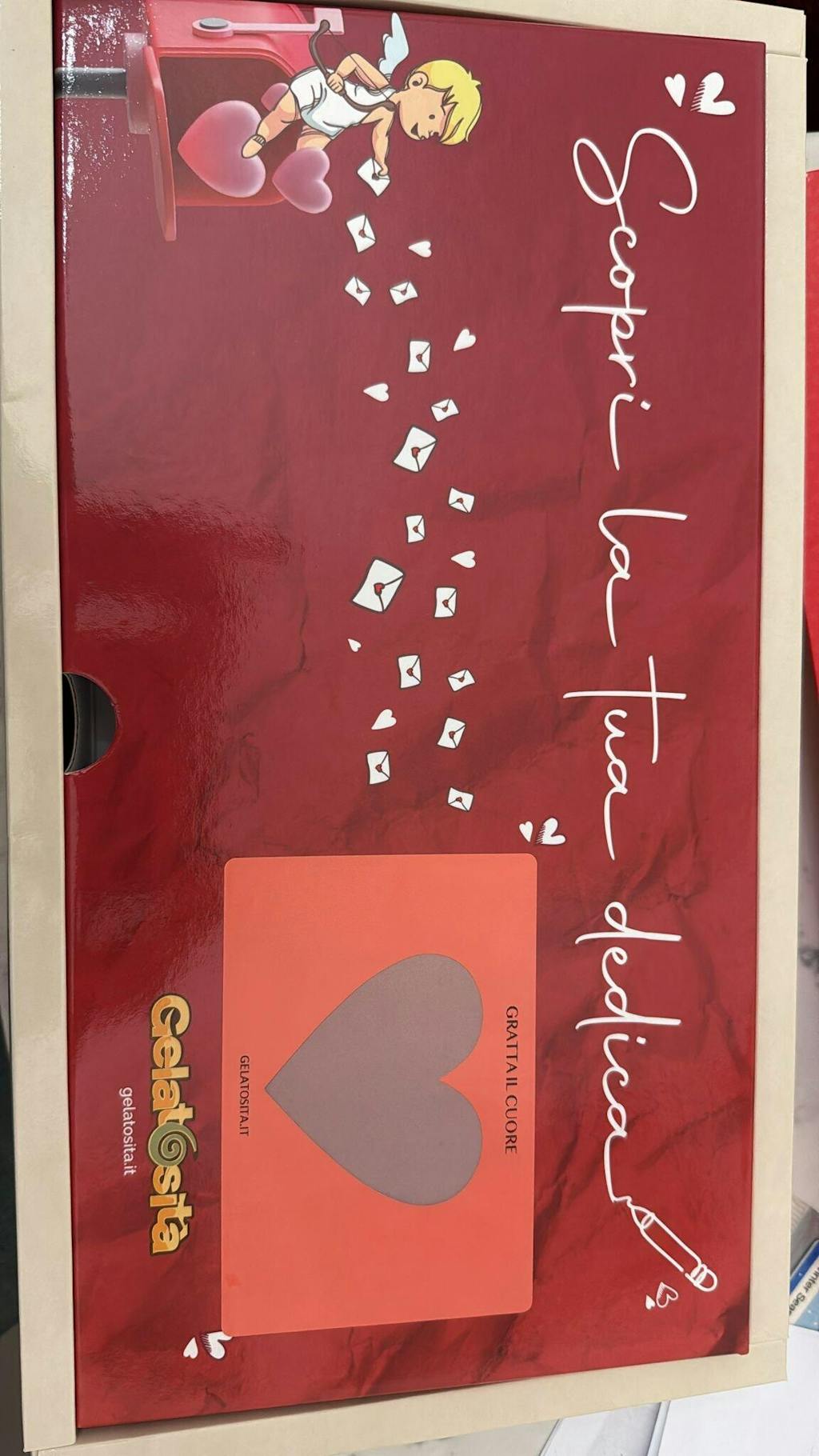 Il cuore era goloso come ce lo si aspettava, la cioccolata bianca con la scritta love molto buona. Le creme buonissime. La frase da grattare é stata una bell'idea originale.